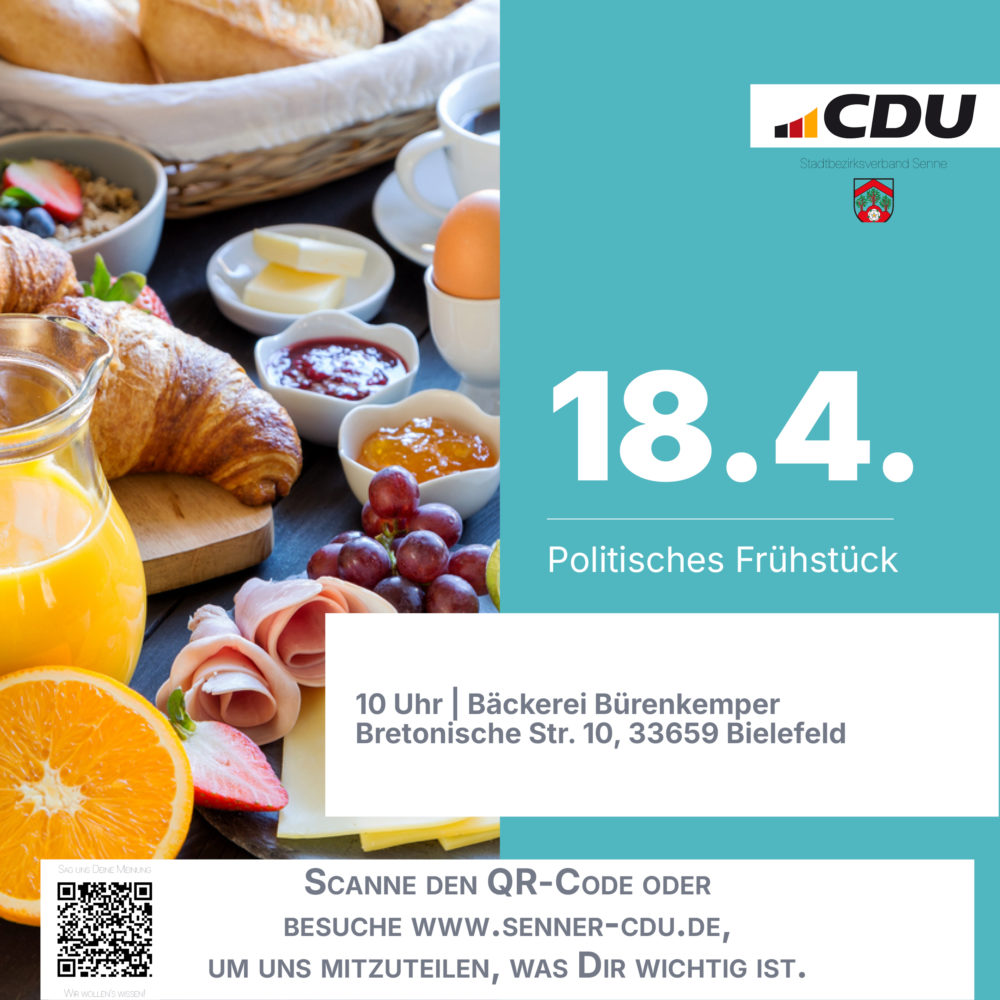 Wir laden Sie herzlich ein zu unserem politischen Frühstück am Samstag, den 18. April 2026, um 10:00 Uhr in der Bäckerei Bürenkemper (Bretonische Str. 10, 33659 Bielefeld). In entspannter Runde